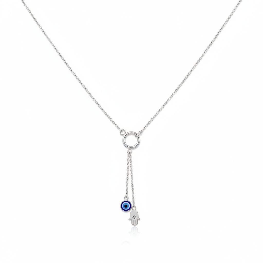 Crafted in polished 925 Sterling Silver, this sophisticated lariat-style necklace seamlessly blends timeless elegance with meaningful symbolism. The delicate cable chain features a central high-polish ring, from which two uneven drops descend, creating a graceful vertical line that elongates the neckline and flatters any complexion. Each pendant showcases the revered Hamsa and Evil Eye motifs—symbols cherished across cultures for their protective qualities and spiritual significance. The asymmetrical design adds contemporary flair while the lustrous finish catches light beautifully, making this piece equally suitable for everyday wear or special occasions. A refined accessory for those who appreciate jewelry that tells a story and carries deeper meaning.