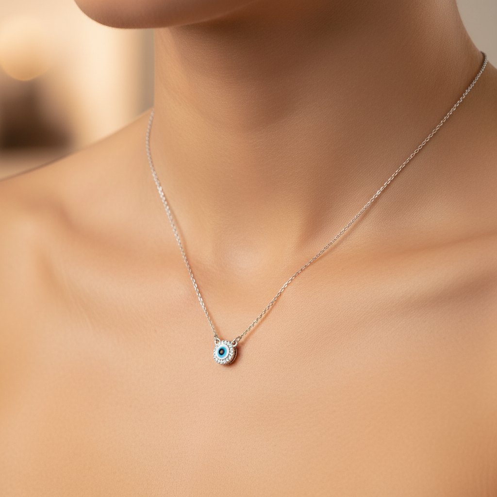 Elevate your daily ensemble with a touch of timeless symbolism and contemporary elegance. This sophisticated necklace features a captivating Evil Eye (Nazar) charm, meticulously handcrafted with concentric rings of deep blue and white enamel that evoke centuries of protective tradition. The striking central eye is encased in a luminous halo of pavé-set crystals, expertly positioned to capture and reflect light from every conceivable angle, creating an enchanting sparkle with each movement. Suspended gracefully from a slender, high-polish sterling silver cable chain, this piece seamlessly marries modern minimalist design with the profound cultural heritage of ancient protective symbolism. The refined proportions and premium materials ensure this necklace transitions effortlessly from casual daywear to evening occasions, making it an indispensable addition to any discerning jewelry collection. Whether worn as a personal talisman or a meaningful gift, The Azure Protection Halo Necklace embodies both aesthetic refinement and spiritual significance.
