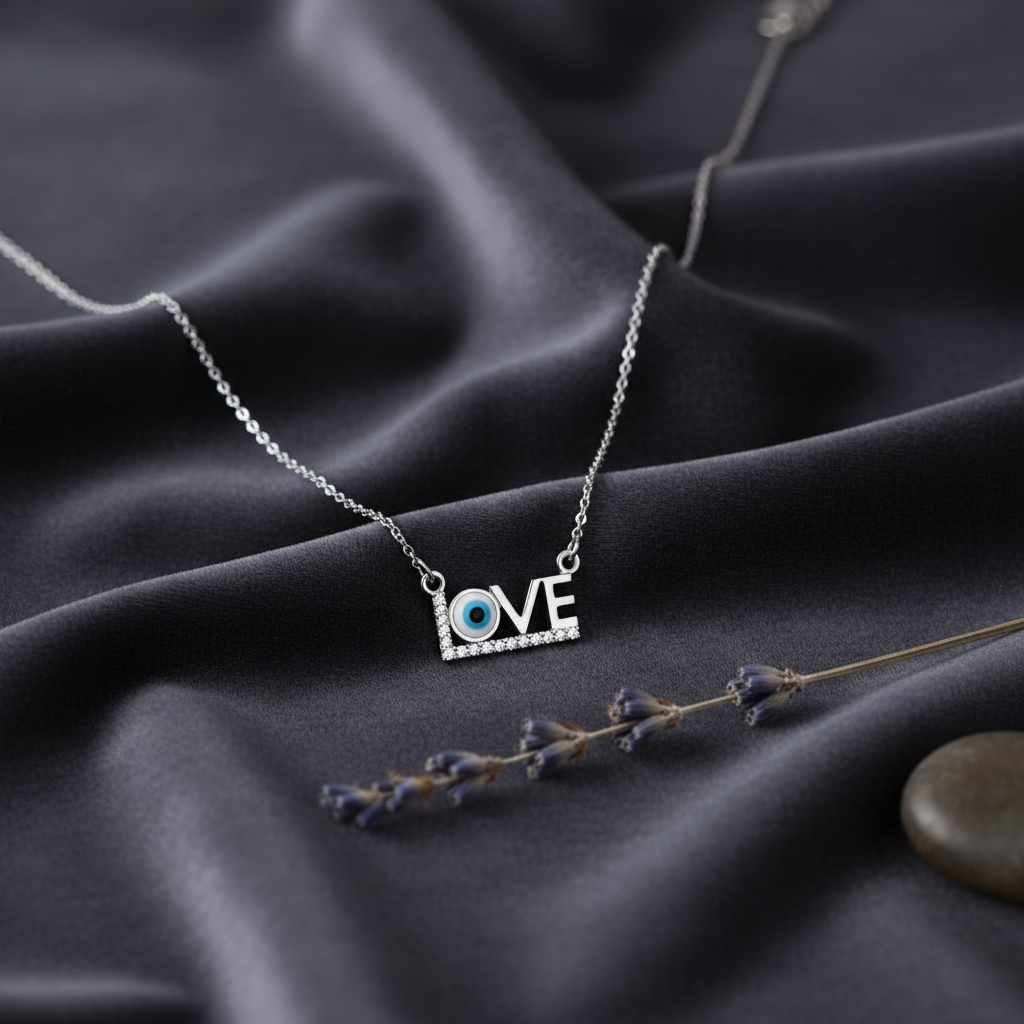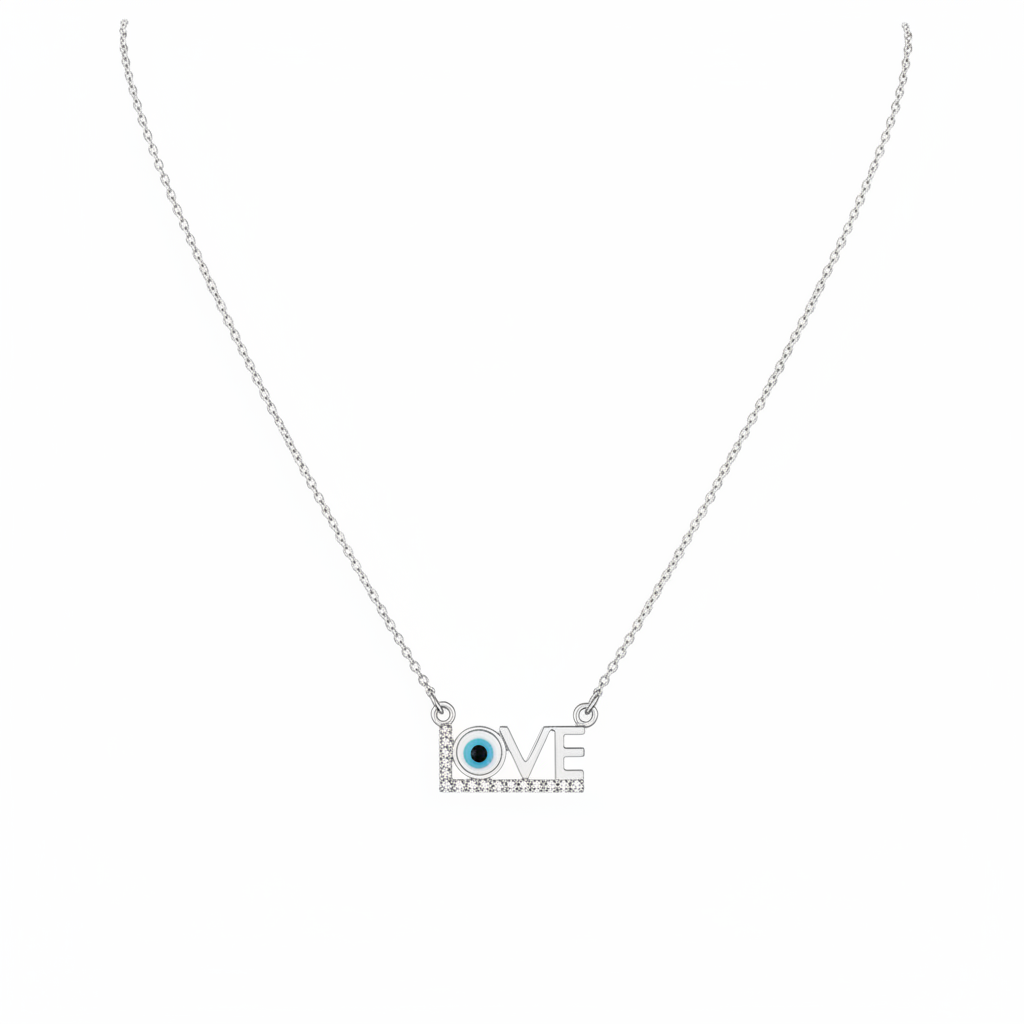This exquisite sterling silver necklace seamlessly merges contemporary typography with timeless spiritual symbolism. The "LOVE" pendant showcases refined craftsmanship, featuring a horizontal base adorned with pavé-set cubic zirconia crystals that catch light with every movement, lending an air of understated luxury. What truly distinguishes this piece is the innovative replacement of the letter "O" with an intricately detailed Evil Eye charm, rendered in delicate light blue, white, and black enamel work. Beyond its aesthetic appeal, the Evil Eye serves as a cherished protective talisman, traditionally believed to shield the wearer from negative influences while inviting prosperity and good fortune. Perfect for those who appreciate jewelry that tells a story—combining heartfelt sentiment with meaningful protection, this pendant becomes more than an accessory; it's a personal guardian you wear close to your heart.