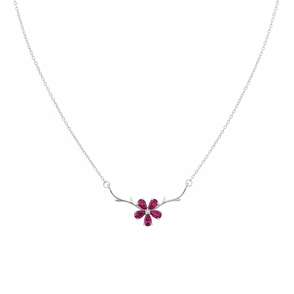 This elegant sterling silver necklace features a unique fusion of organic textures and floral brilliance. At its center sits a vibrant five-petal flower crafted from rich, raspberry-pink stones, accented by a shimmering clear crystal at the heart. The pendant is framed by two gracefully curved silver branches, reminiscent of delicate antlers or spring twigs, which give the piece a whimsical, "woodland-chic" aesthetic. The meticulously crafted design celebrates nature's artistry, blending botanical inspiration with refined metalwork. Each element—from the precisely cut gemstones to the flowing silver curves—has been thoughtfully composed to create a statement piece that transcends seasonal trends. Suspended from a fine cable chain, the necklace drapes beautifully against the skin, allowing the pendant to catch light and showcase its dimensional beauty. Perfect for those who appreciate nature-inspired jewelry with an artistic edge, the Ruby Bloom Antler Necklace effortlessly transitions from everyday elegance to special occasion wear. Whether layered with other pieces or worn as a standalone focal point, it serves as a conversation starter that reflects both personal style and an appreciation for craftsmanship. An ideal gift for the discerning individual who values uniqueness and sophistication.
