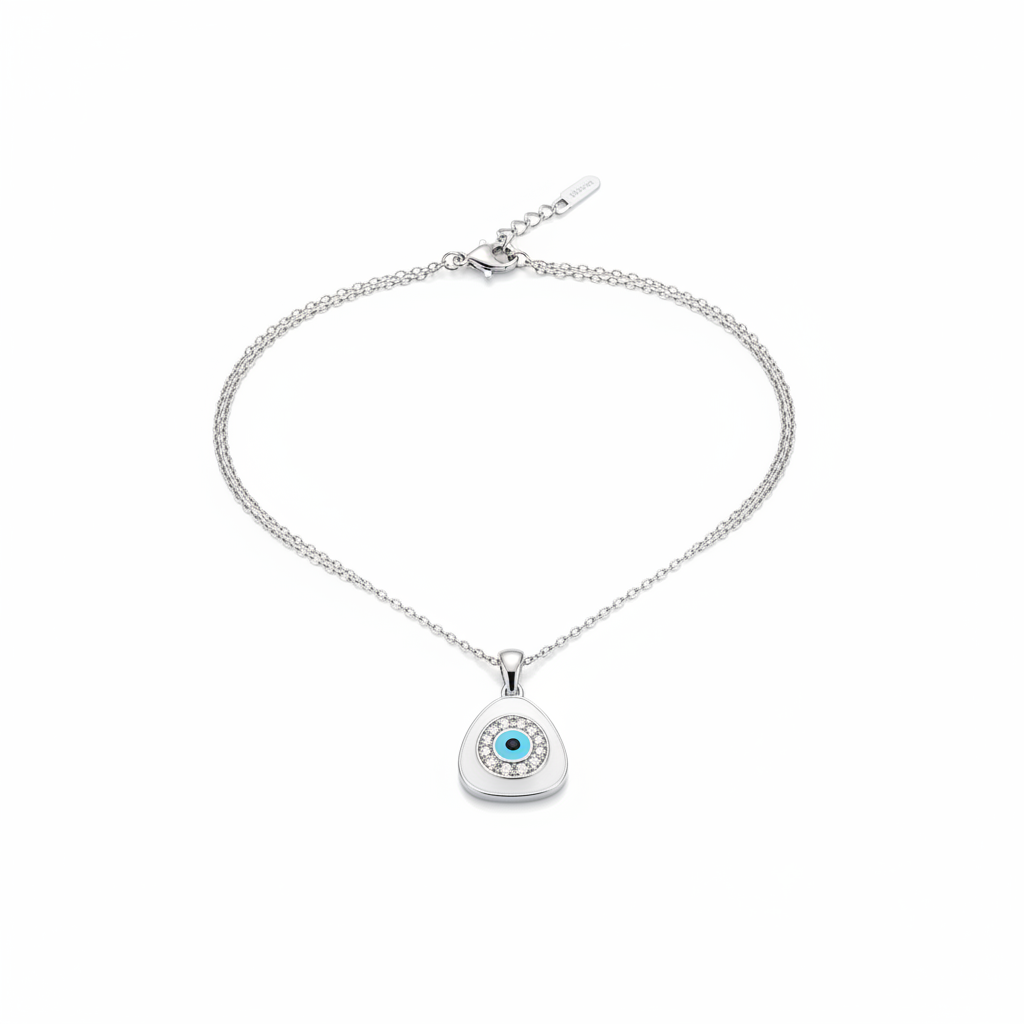 This elegant piece combines ancient protective symbolism with a sleek, contemporary aesthetic. Crafted in high-quality polished silver, the necklace features a double-strand cable chain that provides a delicate yet layered look. The striking evil eye pendant serves as both a meaningful talisman and a refined fashion statement, drawing inspiration from centuries-old traditions of spiritual protection. Perfect for those who appreciate jewelry that transcends mere adornment, this necklace seamlessly transitions from everyday wear to special occasions. The polished finish catches light beautifully, while the thoughtful design ensures comfortable, all-day wearability. A sophisticated choice for anyone seeking to blend cultural heritage with modern elegance.