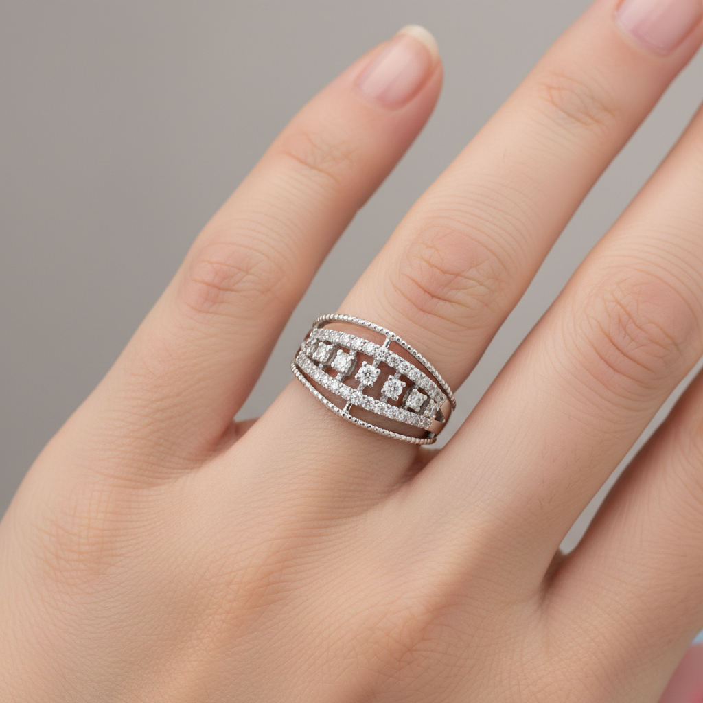 Elevate your jewelry collection with the Elysian Lattice Band, a masterpiece of architectural elegance that seamlessly blends timeless craftsmanship with contemporary design. This wide-profile ring is meticulously crafted from high-polish sterling silver, featuring a distinctive triple-tier open lattice structure that commands attention without overwhelming the hand. The design showcases a striking center row of five square-set stones, each secured by slender vertical pillars that create an illusion of floating brilliance. Flanking this focal point are two gracefully proportioned outer bands adorned with intricate micro-pavé stone settings, adding depth and luminosity to the composition. The innovative "see-through" aesthetic delivers a bold, substantial presence while maintaining an unexpectedly light and comfortable wear experience. Perfect for those who seek jewelry that transcends conventional boundaries, this statement ring celebrates the sophisticated marriage of classical filigree techniques and modern geometric precision. Whether worn as a standalone showstopper or layered with complementary pieces, the Elysian Lattice Band transforms any occasion into an opportunity to express refined taste and distinctive style.